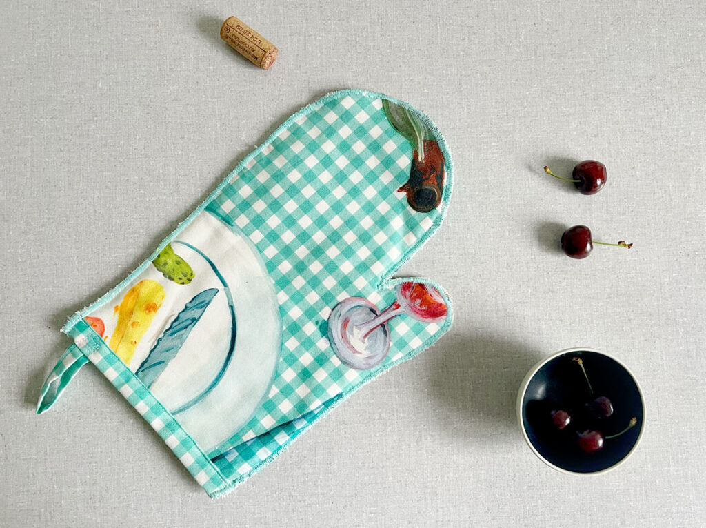 Aus demselben Stoff wie die Fil Rouge Tischtücher «Pique nique» gefertigter Kochhandschuh, originelles Einzelstück «one of a kind»!
